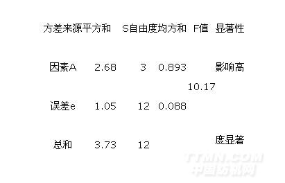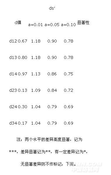表4 對表1中各水平的Scheftb法兩兩比較結果
