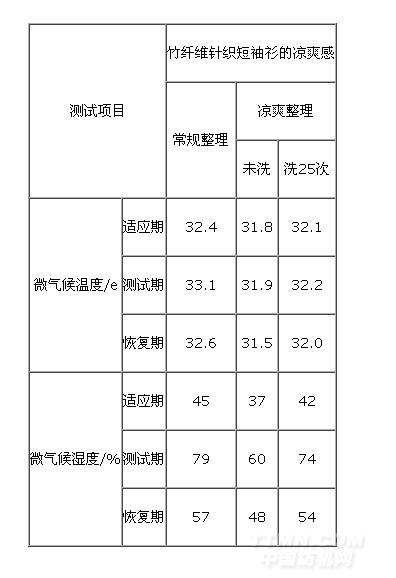 由表1可知,經涼爽整理的竹纖維針織面料,其微氣候溫度較一般竹纖維針織面料低0.6~1.2e,微氣候濕度也顯著降低,水洗25次后仍有效。