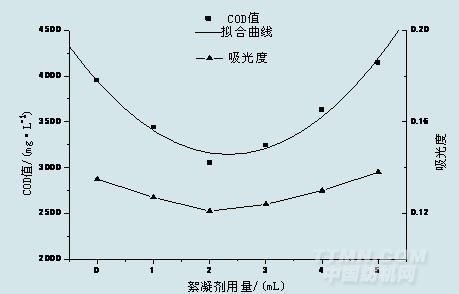 圖4 絮凝劑用量對吸光度及COD值得影響