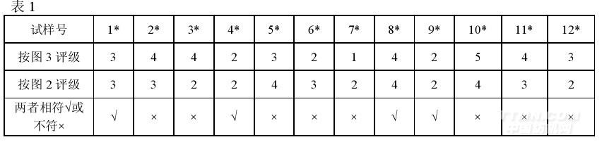 2.不相符,差一個級(包括高一級或低一級的,下同)的試樣是2*、5*、6*、7*、10*、11*、12*號7個,占58.4%。