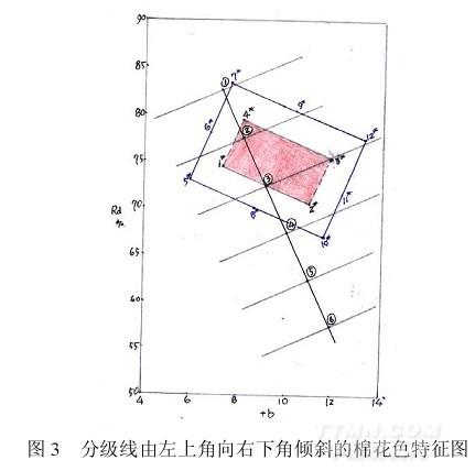 在紅色區(qū)城內(nèi),試樣1*比試樣4*:Rd值偏大;十b又偏小,即又亮又白,還是一樣評2級。同理試樣2*和3*一樣評4級,顯然不合理。