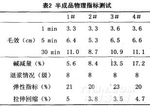 通過分析表1可知:1#~4#工藝處理的半成品白度基本差不多,強力損失程度1#工藝最小,斷裂強力、撕裂強力都比較高,效果最佳,4#工藝燒堿用量增多,但整體指標合格。