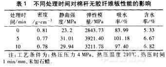 選擇未處理棉稈纖維和處理5min以及處理10min的棉稈纖維壓制無膠纖維板(密度0.8cm,厚度4nm),研究冷等離子體處理對棉稈無膠纖維板性能的影響,結果如表l所示