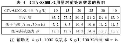 CTA-8800L-2由精練劑、滲透劑、穩定劑、堿劑、螯合分散劑和除蠟劑等經特殊加工復配而成,集乳化、滲透、分散和穩定等性能于一身,適用于棉型織物的半漂加工。將棉織物在不同用量的CTA-8800L-2氧漂液中浸軋后汽蒸,測試處理后織物的性能,結果見表4。