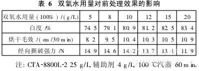 從表6可以看出,隨著雙氧水用量增大,織物毛效稍有提高,白度有較大提高,但撕破強力呈下降趨勢。綜合考慮,雙氧水用量以8~10g/L為宜。