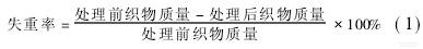失重率 將織物于105℃烘箱中烘至恒重,置于干燥器中冷卻至室溫后,取出稱重。失重率按式(1)計算: