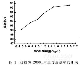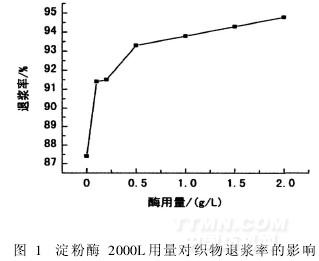 改變淀粉酶2000L用量分別為0,0.1,0.2,0.5,1.0,1.5和2.0g/L,其它工藝條件見1.2節,淀粉酶2000L用量對退漿率的影響,見圖1。