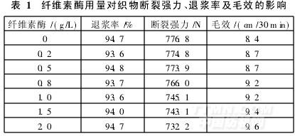 纖維素酶能有效去除纖維表面絨毛,提高織物表面光潔度和柔軟性,增加織物的懸垂性[3]。試驗中,淀粉酶2000L用量0.5g/L,纖維素酶CR用量分別為0,0.2,0.5,0.8,1.0,1.5和2.0g/L,其它工藝條件見1.2。鑒于纖維素酶的降解作用,測試纖維素酶用量對織物斷裂強力、退漿率以及毛效的影響,結果見表1。
