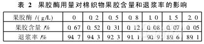淀粉酶2000L0.5g/L,果膠酶L用量分別為00.2,0.5,0.8,1.0,1.5和2.0g/L,果膠酶用量對織物果膠含量和退漿率的影響見表2。
