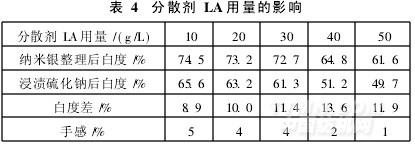 由表4可知,當分散劑LA用量達到30g/L后,織物的白度差增大,說明整理織物表面吸附的納米銀量增加,手感變差。因此,取分散劑LA用量為20g/L。