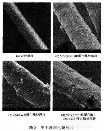 從圖5可看出,未處理羊毛纖維表面鱗片完整光滑,輪廓清晰,排列緊密。單獨(dú)使用角蛋白酶處理后,羊毛鱗片依然很完整,只是邊緣有一點(diǎn)凸起。這是因?yàn)閱为?dú)使用角蛋白酶處理對(duì)鱗片的降解不夠強(qiáng)烈,鱗片破壞不明顯。單獨(dú)使用蛋白酶處理后,羊毛纖維表層變得粗糙,鱗片張開且邊緣翹起,說明蛋白酶的水解作用主要是針對(duì)鱗片細(xì)胞問復(fù)合物。經(jīng)角蛋白酶+蛋白酶一浴法處理后,羊毛表面鱗片明顯受到破壞,大部分鱗片已基本剝離,纖維表面變得光滑。說明角蛋白酶+蛋白酶一浴法處理的降解效果相當(dāng)強(qiáng)烈,羊毛鱗片已基本剝離。