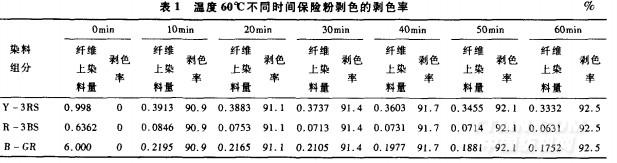 從表1可知,溫度60℃不同時間保險粉剝色時,隨著時間的延長,紗線的染料殘留量明顯減少。剝色率大大地提高。剝色時間在50~60min比較合適。