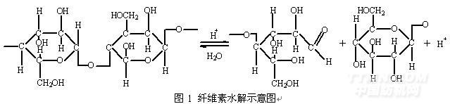 本方法采用60%的硫酸溶液,溶解莫代爾/棉纖維混紡產品中的莫代爾纖維,不溶物為棉纖維。溶解機理為:纖維素大分子的1,4-甙鍵對酸的穩定性很低,在適當的氫離子濃度、溫度以及時間條件下,會發生水解而降解,使相鄰兩葡萄糖單體間碳原子和氧原子所形成的化學鍵發生斷裂。過程初期,試劑迅速滲入纖維的無定形區,使這個區域的大分子降解,這時水解速率很快,當無定形區全部被破壞后,由于試劑向結晶區內滲透較為困難,所以只能使結晶區發生由表及里的水解反應,這時水解反應速率明顯降低,同時纖維素發生解體。因此,可以利用棉纖維與莫代爾纖維的聚合度、結晶度等性質差異,選擇一定濃度的硫酸溶解莫代爾纖維,剩余棉纖維,由試驗獲得棉纖維的重量修正系數,然后計算得到兩組分的含量即混紡比例。水解過程示意圖見圖1。