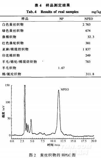 采用本文確定的實驗方法對出口歐盟的紡織品樣品進行了測試,測試結果見表4。從表4可以看出,出口紡織品中主要使用NPEO,大部分樣品中均可檢出濃度不等的NPEO,僅有1個樣品中檢出NP,而OP和OPEO則均未檢出。圖2為蠶絲織物甲醇萃取溶液的HPLC圖,可以看出,該樣品中殘留有NPEO.