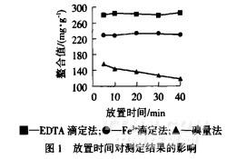 從圖1可以看出,EDTA滴定法和Fe3+滴定法測定結果基本不受放置時間的影響,而碘量法隨放置時間的延長螯合鐵離子值逐漸減小.原因是碘量法測定過程中,過量的I一在酸性條件下逐漸被空氣中的氧氣氧化生成I2,同時體系中生成的Fe2+在酸性條件下被空氣氧化生成Fe3+繼續(xù)氧化溶液中過量的I一,從而導致測定結果隨放置時間的延長逐漸減?。?/p>