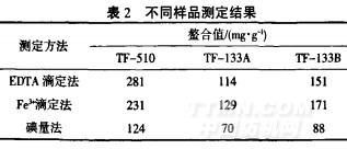 綜合考慮,F(xiàn)e3+滴定法(用磺基水楊酸顯色)相對標準偏差最小,操作簡單、方便且不受放置時間、樣品本身顏色的影響,故測定螯合劑螫合能力時選擇此法為宜.EDTA滴定法測定TF-510螯合鐵能力時,由于TF-510螯合能力相對較強,在與Fe3+作用的過程中體系顏色(黃色)逐漸加深,從而影響滴定終點(亮黃色)的判定.其次,此法受樣品顏色的影響,故結果相對偏高.