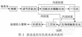 有色水處理部分新改進流程為擋板式水解酸化-接觸氧化-砂濾處理,其流程見圖2。