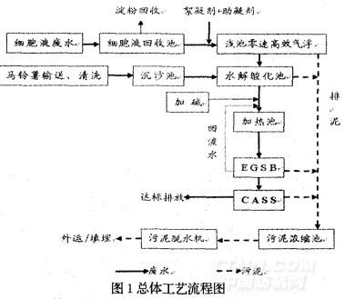 在淀粉生產過程中產生的生產廢水含有淀粉、糖類、蛋白質、有機酸等溶解性有機物質,小顆粒淀粉、纖維等不溶性細小顆粒有機物及泥砂等無機物。為了減輕后續處理構筑物的處理負荷,保護后續處理設施,應在馬鈴薯輸送、清洗排放的廢水預處理處理設施的前端安裝旋轉沉沙池、格柵等,以截留原污水中較大的懸浮物或漂浮物、去除廢水中泥沙。而在主生產線排放細胞液廢水中,需要通過沉淀、淺層氣浮等物理方法去除懸浮物、膠體物質及部分有機物,同時回收植物蛋白飼料等川。