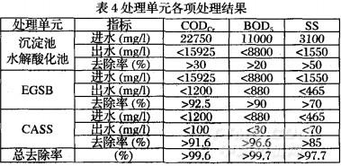 調(diào)試運(yùn)行成功后,對各處理單元進(jìn)行連續(xù)10d每天取樣2次的定期監(jiān)測。各處理單元的處理效果見表4。