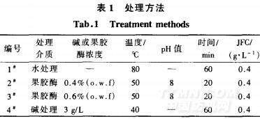 采用AS181A梳棉試驗機(上海紡織工學院機械工廠)梳棉,然后分別稱取5 g樣品按表1所示的方式進行處理。浴比為40:1,緩沖液采用Nail P04和NaOH進行調節,果膠酶Scourzyme L由諾維信公司提供。纖維經過處理后,水洗晾干。