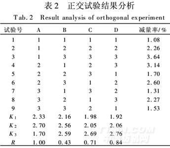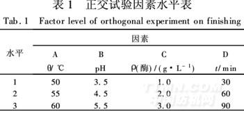 試樣為亞麻織物2g/塊,浴比1∶25,進行溫度、pH值、酶用量、時間四因素的L9(34)正交試驗,試驗因素水平見表1,結果見表2。