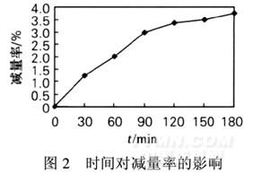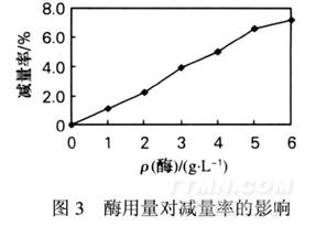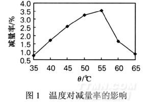 由圖1可見,隨著溫度的升高,減量率逐漸增大,溫度為55℃時,其值最大,之后,隨著溫度的升高減量率下降,溫度為65℃時,減量率不到1.0%。可見,纖維素酶對溫度非常敏感,因此,在酶處理工藝中,控制溫度尤其重要。