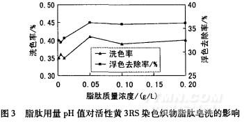 由圖1和圖2的浮色去除率和洗色率可以看出,堿性條件下的皂洗效果比酸性條件的好,在中性至堿性較寬的pH值范圍內的皂洗效果均較好,且在pH值為9時達到最好,這可能與脂肽本身的溶解度有關。脂肽類生物表面活性劑是陰離子型表面活性劑,具有兩親結構,可溶于堿性溶液中,而在酸性溶液中的溶解度較差。