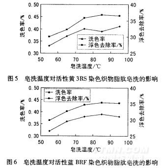 pH值為9,脂肽質量濃度為0.05g/L,改變皂洗溫度,按1.3.3(1)節對活性黃3RS和活性藍BRF染色棉織物進行皂洗,結果見圖5和圖6。