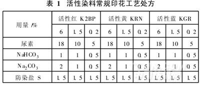 綜合考慮反應性及穩定性,通常使用K型活性染料,也有應用一部分穩定性好、沾色少的KN型和M型活性染料。選擇常用的紅、黃、藍三只活性染料,按深、中、淺濃度進行試驗。常規工藝處方如表1所示。