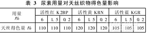 活性染料印花中,尿素起幫助染料溶解,在汽蒸時使纖維溶脹膨化,提高得色量的作用。將尿素用量增加5%后在天絲織物上刮樣,以常規工藝刮樣作標準(100%)進行比較,結果見表3。