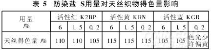 在汽蒸過程中,防染鹽S可防止活性染料受還原性物質(zhì)的影響而導(dǎo)致色萎。將防染鹽S用量增加0.5%后在天絲織物上刮樣,以常規(guī)工藝刮樣作標(biāo)準(zhǔn)(100%)進行比較,結(jié)果見表5。
