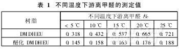 低甲醛樹脂的生產過程一般分兩步,第一步先用甲醛、乙二醛和脲反應生成DMDHEU樹脂;第二步將DMDHEU樹脂與多元醇醚化生成低甲醛樹脂。以上兩步中,甲醛與酰胺生成羥甲基的化學反應是可逆的,因而無論是否進行醚化,樹脂中始終會有一部分游離甲醛存在。用鹽酸進行分析滴定時,當樹脂溶液中的游離甲醛與亞硫酸鈉反應消耗后,羥甲基化合物還會水解釋放出一定量的甲醛。溫度對羥甲基化合物的水解反應影響很大,表1是在溫度5~30℃范圍內測出的同一樹脂樣品的游離甲醛值。