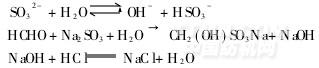 亞硫酸鈉易水解,會使其水溶液的pH值升高,因此需要先用稀鹽酸溶液調節pH值至9. 6。加入待測的甲醛樹脂溶液后,溶液中的甲醛與過量的亞硫酸鈉發生加成反應,生成甲醛的加成物和氫氧化鈉;生成的氫氧化鈉再用標準鹽酸溶液滴定pH值至9. 6為終點。其反應式如下: