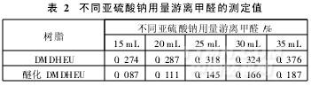 用不同亞硫酸鈉用量測定的游離甲醛值見表2。當12. 5%的亞硫酸鈉用量低于25 mL時,甲醛與亞硫酸鈉的加成反應進行得不充分,生成的氫氧化鈉量少,測定值偏低。反之,當亞硫酸鈉用量大于25 mL時,過量的亞硫酸鈉水解產生的氫氧化鈉需要更多的鹽酸來中和,因而測定值偏高。亞硫酸鈉用量越大,偏差越大。因此,樹脂中游離甲醛量低于1 %時, 12. 5 %亞硫酸鈉用量取25 mL為宜。