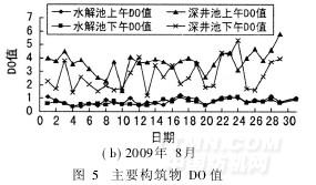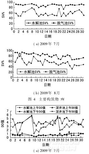 由圖4和圖5可知,水解池中保持穩定的低DO值(測量儀器為便攜式酸度計pHB-1),有利于厭氧水解,提高污水的可生化性,使SV值也保持穩定狀態(57%左右),從而保持一定的生物量和處理能力。深井池中DO值會受到溫度的影響,但總體而言,其DO值較高,說明深井池內部DO充足穩定,出水也能保持一定的DO水平。脫氣池的SV值穩定在85%左右,有利于沉淀。