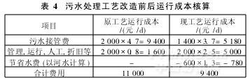 該公司所購工業用水水價為1.3元/,t自來水價格為2.8元/,t每天用水量2000,t運行費用(包括人工,折舊,維修等)2.5元/,t改造前運行費用0.8元/t。計算運行成本時,污水量按進水量計,一年運行時間按360天計,接管污水費用以COD值計價,目前某污水處理廠COD的接管標準為500mg/kg,標準以內處理費用為3.7元/,tCOD每超過100mg/kg,處理費用加0.2元/,t其它指標每超過一項加0.2元/t。原處理工藝出水以COD在900~1000mg/kg區間計算,現處理工藝出水符合標準。該公司污水處理工藝改造前后運行成本核算見表4