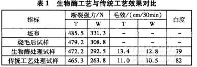 粘膠/亞麻混紡織物經生物酶兩步法工藝與傳工藝前處理后,其強力、毛效和白度對比見表1。