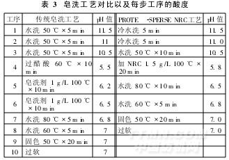 傳統(tǒng)皂洗工藝與中和皂洗劑PROTE(-SPERSENRC工藝及酸度的對(duì)比見表3。