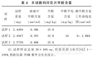 分別取3個羊絨數碼印花片試樣,測其甲醛含量,其結果滿足低于標準甲醛含量,結果參見表4.