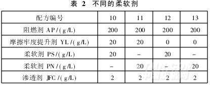 比較兩種常見的柔軟劑PS和PN對織物摩擦牢度的影響。按表2的配方配制阻燃整理工作液。