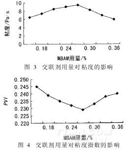 由圖3可見,隨交聯(lián)單體MBAM用量增加,聚合物的增稠能力先上升后下降,當(dāng)交聯(lián)單體質(zhì)量分數(shù)為0. 27%時,粘度最大。圖4顯示此時的粘度指數(shù)PVI達最小值,即增稠劑有較好的假塑性,耐機械剪切能力