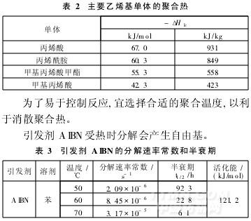 丙烯酸和丙烯酰胺均屬乙烯基單體,聚合反應(yīng)時放出大量的熱,其聚合熱[8]見表2。
