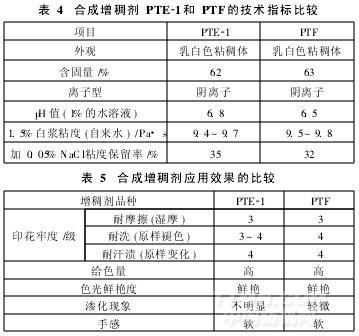 目前,英國聯(lián)合膠體公司的AlcoprintPTF產(chǎn)品幾乎占據(jù)了國內(nèi)涂料印花用合成增稠劑的大部分市場。AlcoprintPTF增稠能力強,含固量60%左右,觸變穩(wěn)定性好,適用于各種纖維的手工、機械印花[10]。本試驗制備的增稠劑PTE21不含火油、APEO、重金屬、致癌物質(zhì),使用時無需加氨水,成糊具有良好的觸變、剪切、耐電解質(zhì)等性能。在相同條件下,將增稠劑PTE21與進口AlcoprintPTF的各項技術(shù)指標進行評定,并分別進行印花測試,結(jié)果見表4、5。
