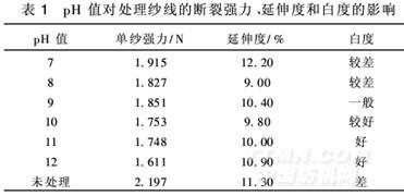 由表1分析,因竹纖維耐堿性較差,隨著處理液pH值的升高,竹纖維紗線強力逐漸有所降低,但白度在pH值大于9以上時亦增加明顯,所以處理液的pH值宜控制在10左右。