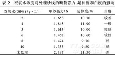 按2.2的工藝條件,固定Na2SiO3濃度Y為2g/L,pH值Z為11,改變雙氧水(30%)的濃度分別為2、4、5、6、8、10g/L對竹纖維紗線進行前處理,試樣按1.4.2方法測試和目測評定白度,結果如表2。