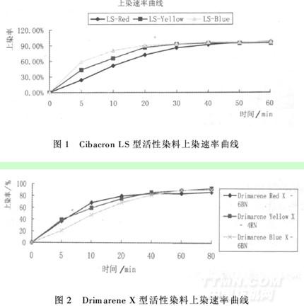 按1.3.1的方法及表3~6所確定的最佳工藝條件,以對竹纖維織物有著較好染色效果的DrimareneX型及CibacronLS型染料為研究對象,對其三原色染料在竹纖維上的上染率隨時間變化做出上染率曲線見圖1及圖2。