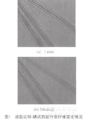 竹漿纖維在氯化鋅-碘試劑作用下,1min時(shí)沒(méi)有出現(xiàn)變化,如圖1(a)所示,隨著時(shí)間的延長(zhǎng),竹漿纖維逐漸呈墨綠色,且出現(xiàn)膨脹,約在20min后纖維表面的溝槽及棱子逐漸溶解,纖維逐漸變細(xì),如圖1(b)所示。竹原纖維經(jīng)氯化鋅-碘試劑作用后,纖維呈淡淡的藍(lán)青色,30min內(nèi)纖維外觀沒(méi)有出現(xiàn)明顯變化,如圖2(a)、(b)所示。兩種纖維素纖維經(jīng)氯化鋅-碘試劑處理后出現(xiàn)了明顯不同的特性,這與其兩種纖維的結(jié)晶度不同有關(guān),已有文獻(xiàn)報(bào)道[1]竹漿纖維的結(jié)晶度低于竹原纖維,結(jié)晶度高的竹原纖維內(nèi)部空隙小,分子難以滲透進(jìn)入纖維內(nèi)部區(qū)域,因此,氯化鋅-碘試劑對(duì)竹原纖維處理的影響較小;相反,結(jié)晶度相對(duì)比較低的竹漿纖維內(nèi)部空隙比較大,分子也比較容易滲透進(jìn)入纖維內(nèi)部區(qū)域,纖維經(jīng)氯化鋅-碘試劑處理后出現(xiàn)溝槽及棱子溶解現(xiàn)象。