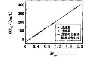 經(jīng)過計(jì)算機(jī)擬合的過濾后回歸方程的相關(guān)系數(shù)R為99.997%,剩余標(biāo)準(zhǔn)離差SE為0.818。與過濾前相比,過濾后的回歸方程具有更大的相關(guān)系數(shù)和更小的剩余標(biāo)準(zhǔn)離差,說明過濾后CODCr與UV254具有更好的相關(guān)性,且精密度更好。由圖2可知,對(duì)于同一試樣,過濾后的CODCr值降低了,這是因?yàn)檫^濾后顆粒狀的有機(jī)物被懸浮顆粒吸附而被去除,試樣中有機(jī)物的含量減少,此時(shí)所測值反映的是溶解性有機(jī)物的CODCr值。