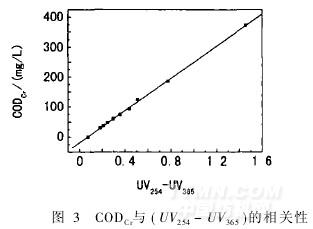 測定未經過濾處理試樣的UV254、UV365與CODCr,計算ΔUV(=UV254-UV365)。ΔUV與CODCr的相關性見圖3。擬合的回歸方程為: