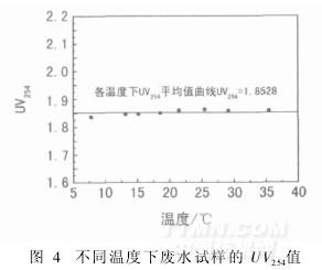 為了研究溫度對試樣UV254值的影響,分別在溫度為7.8、13.2、15.2、18. 6、21.5、25.5、29.2、35.5℃下